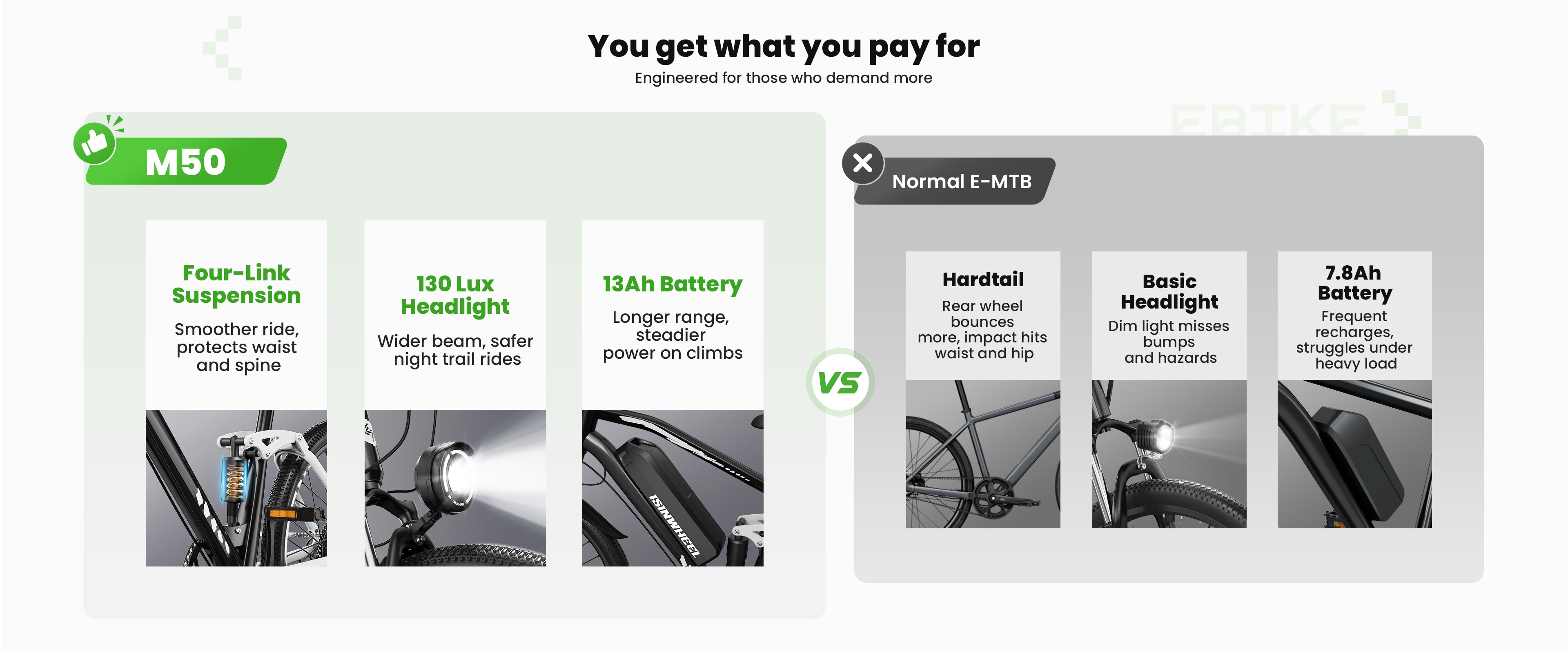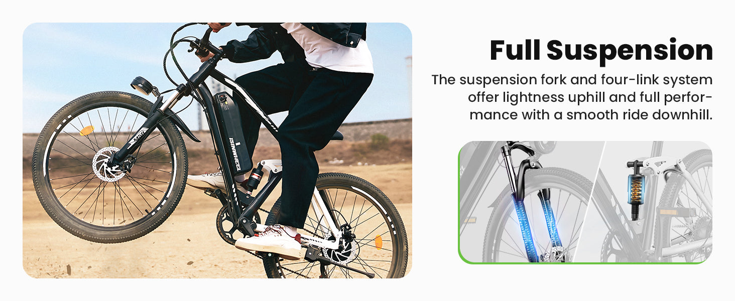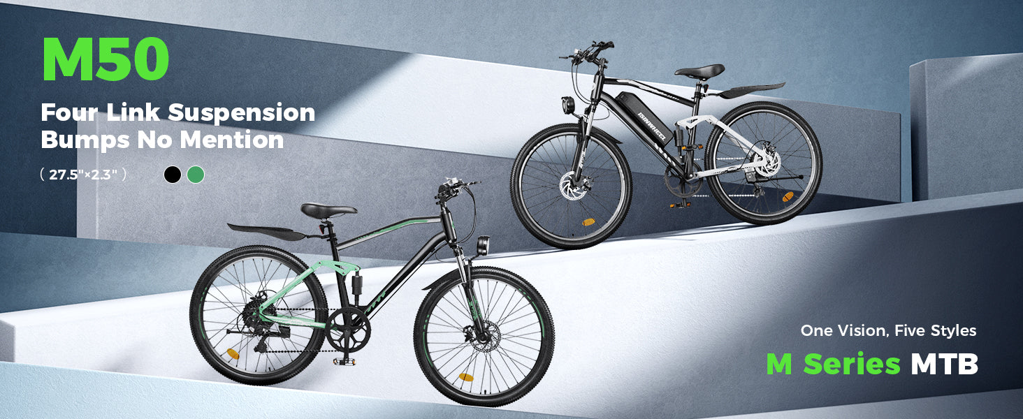 The M50 is designed for high-traction tires built for rugged trails, rocky paths, and unpredictable terrain, equipped with 27.5*2.3“ tires and a durable frame for enhanced stability and traction.