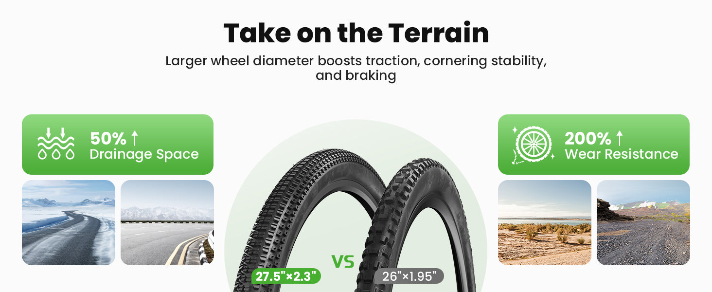 2. Drainage capacity: Boasts 50% more drainage space than the 26*1.95" tire, effectively reducing hydroplaning risks on wet surfaces.
