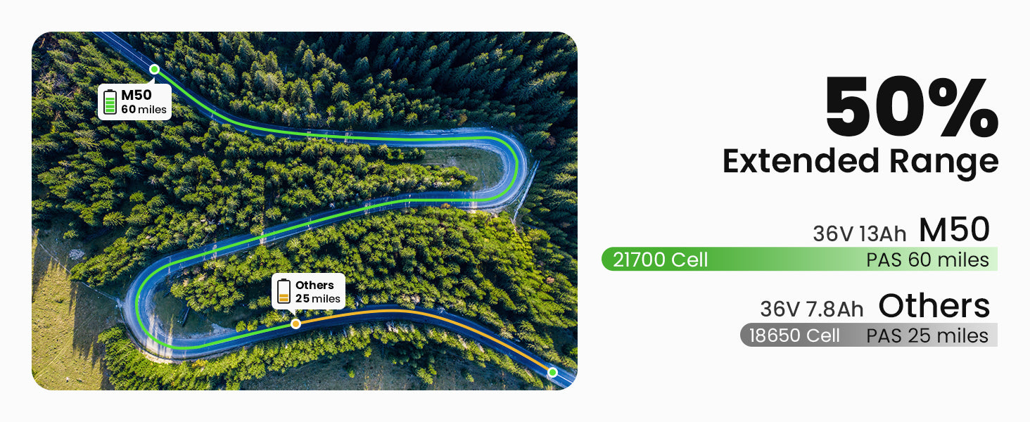 The M50 is equipped with a 468 Wh battery, providing a range of up to 55-60 miles per charge depending on terrain, rider weight, and assist level.